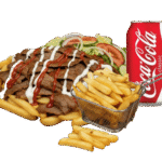 Kebab de ternera, pollo o mixto con ensalada y salsa + Patatas + Bebida.